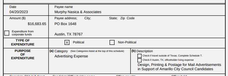 The finance report from Protect and Serve also shines some light on the mailer itself. The mailer appears to be listed as an “unpaid incurred obligation” in the amount of $16,683.65. The bill is due to be paid to Murphy Nasica & Associates, a consulting firm which was previously used by Amarillo Matters.