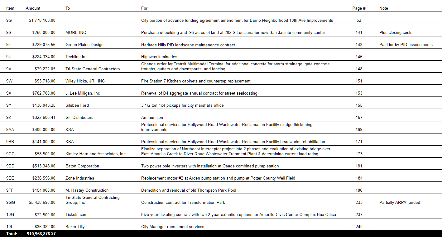 According to the agenda packet for the meeting, the largest spending item is item 10G, a $5.4 million contract with Tri-State General Contracting Group for the construction of Transformation Park. According to the packet, the project aims to “provide safe housing and care for the homeless within the City of Amarillo and an opportunity to enhance the quality of life for those that may need helpful services.” The project is partially funded through ARPA. A nonprofit group has also committed to fundraising an additional $1.5 million for the project.